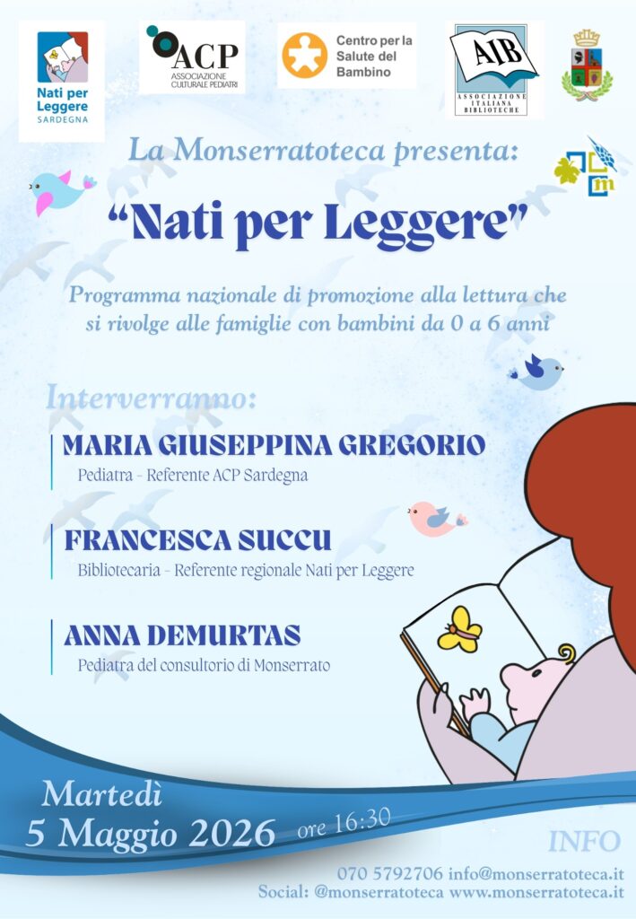 Martedì 5 maggio 2026, alle ore 16:30, la Monserratoteca vi invita a un incontro dedicato a Nati per Leggere, il programma nazionale che promuove la lettura nella fascia d’età 0-6 anni.